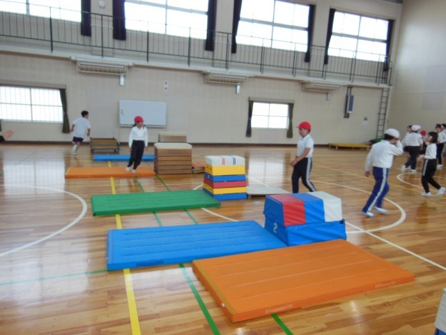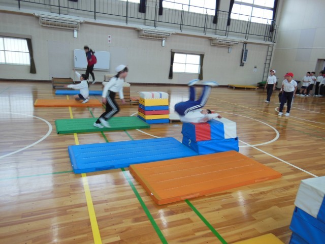 3・4年生の体育は先週に続いて跳び箱運動です。それぞれ自分のレベルに合った高さの跳び箱での練習です。開脚跳びや台上前転など、それぞれ繰り返し練習をしています。