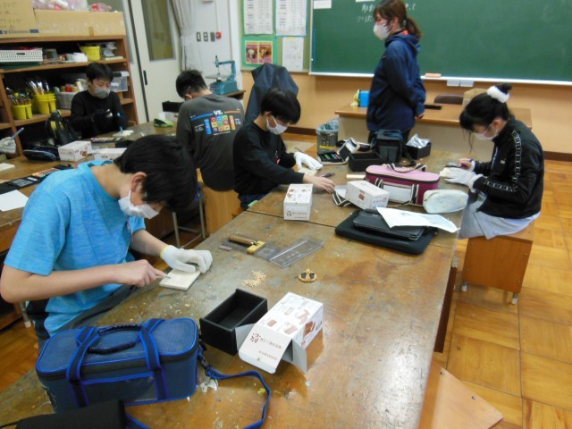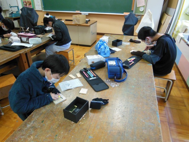 6年生の図工は、最後の単元です。卒業記念製作を行っています。オルゴールケースの部分に彫刻刀を使って小学校の思い出を彫っています。小学校の花や級訓を彫っている子がいました。