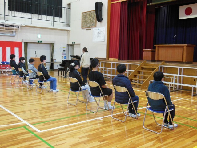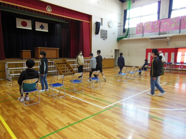 卒業式練習2日目です。今日は入場の練習から証書の授与の仕方を練習しました。最初の入場では、一定の間隔を空けてあることに気を付けて練習しました。少しずつ会場の準備も整ってきました。
