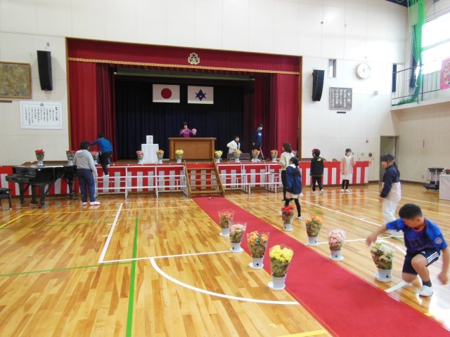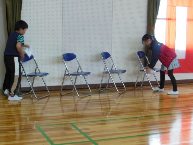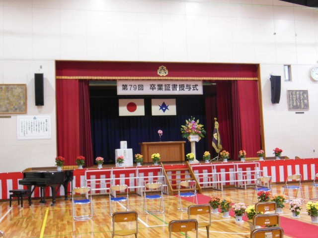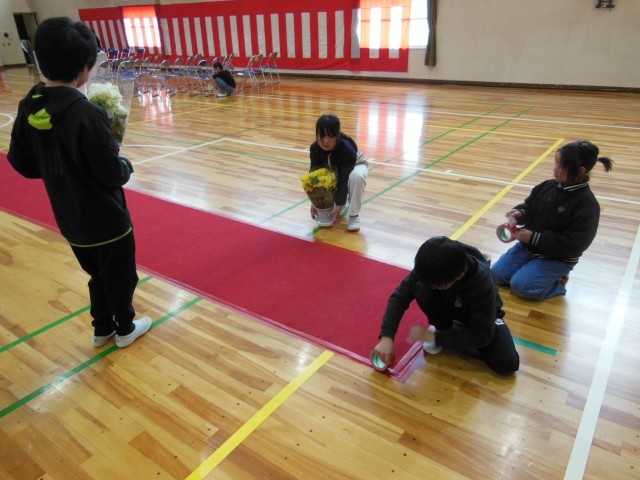 卒業式を明日に控えて今日は、午後から4・5年生が会場の準備をしました。体育館の中はもちろん玄関回りなどみんで協力して予定より早く仕上がりました。すばらしい会場ができました。