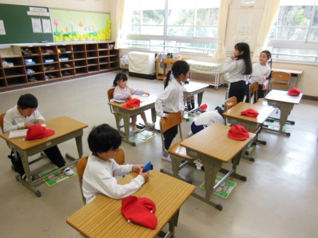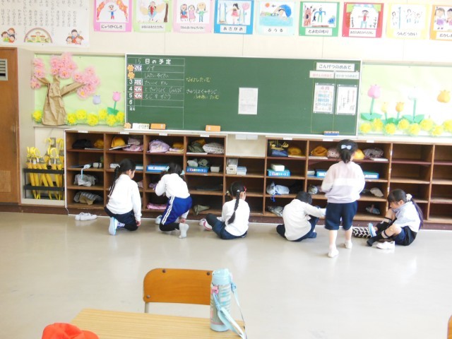 今日の1年生の様子を紹介します。今日は、身体計測を行いました。順番を待っている子も静かに待つことができました。なかよしタイムは教室で過ごしていました。今日は、天気が悪く自分の席でお絵描きをしたり折り紙をしながら過ごしていました。3時間目の予鈴の音楽が流れると素早く体育館シューズに履き替えて次の授業の準備をする姿が見られました。