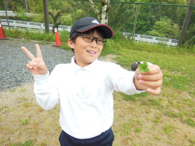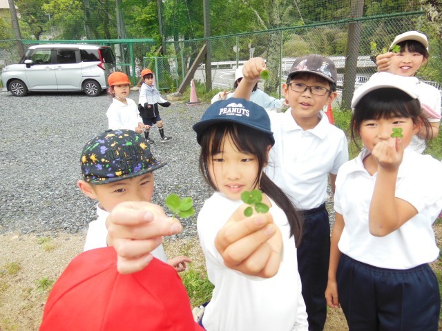 雨上がりの運動場で虫探しでもしているのかと思い近づいてみると「四葉のクローバーを見つけたよ」と見せてくれました。一人が差し出すと次から次へと見つけて見せてくれました。しばらくみんなで四葉探しです。