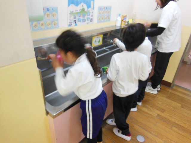 口に含んでぶくぶくした後に流しに行きます。上手にできたようです。