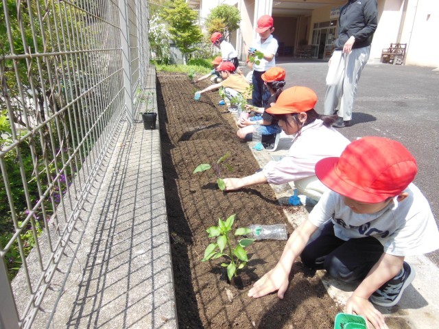 今日は、雨上がりのすばらしい天気になりました。2年生は、生活科で野菜の苗を植えました。保護者のみなさんの協力でそれぞれが選んで購入してきた野菜の苗を植えました。ナス、ピーマン、トマト、きゅうりなど様々な野菜の苗です。夏休み前には収穫できるといいですね。