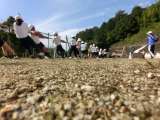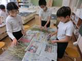 5年生は、手作業による脱穀作業をしました。稲の穂からモミを落とすのにどうしたら...
