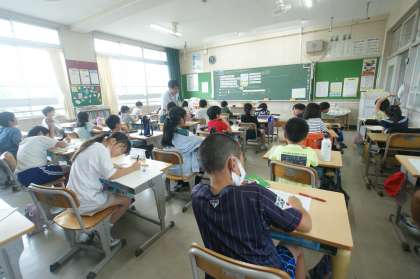 写真下…3年2組、算数「図を使って考えよう」の学習です。