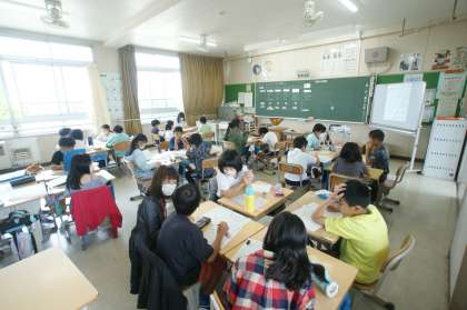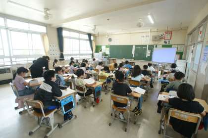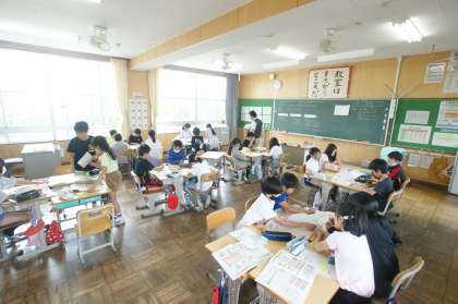 写真上…4年1組、総合的な学習の時間「ごみ減らし大作戦」の学習です。