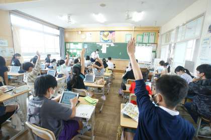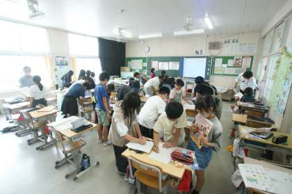 写真下…5年2組、道徳「たいせつなきまり『通学路』」の学習です。