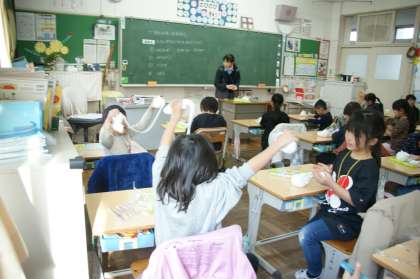 写真上…1年1組、図工「ごちそうパーティーをはじめよう」の学習です。