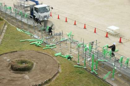 写真下…150周年記念・大運動会を終えて、大活躍した足場の解体作業が始まりました。
