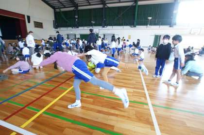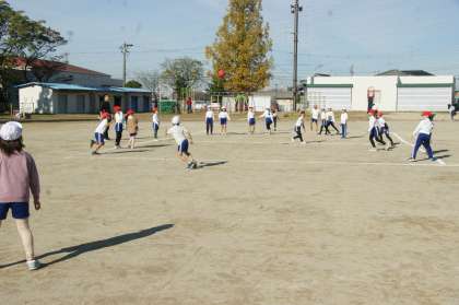 写真中…2年2組、体育「ボール投げ遊び」の学習です。