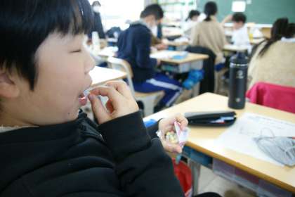 写真中…6年2組教室にて、おいしそうに食べる男児