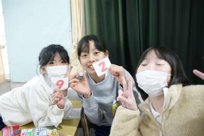 写真下…5年1組教室にて、金平糖をもらってうれしそうな女児