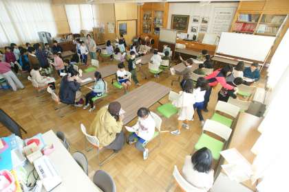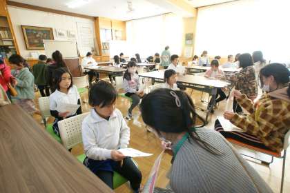 写真下…午後の休み時間の「九九チェック」の様子