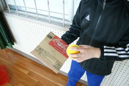ハンドテニスを改良して、手の代わりに段ボールラケットを、ボールには軽いスポンジボールを使います。