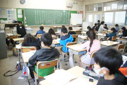 写真上…3年1組、国語「自分の考えを伝えよう」の学習です。