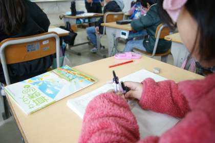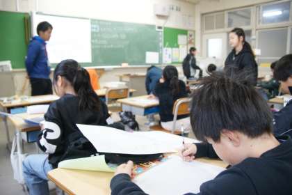 写真中…3年2組、図工「いろいろうつして」の学習です。