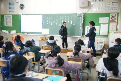 写真上…3年1組、国語「自分の考えを伝えよう」の学習です。