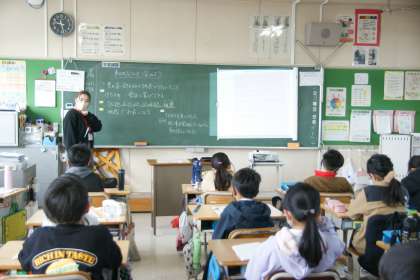 写真中…4年2組、社会科「車の町・豊田」の学習です。