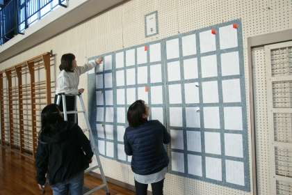 写真中…明日から18日(木)まで、全校児童の書き初め作品作品を展示する「書き初め展」を開催します。