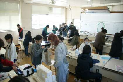 地域学校共働本部ミシンボランティアの皆さんにお手伝いをいただき、ミシンを使ってエプロンを作っています。