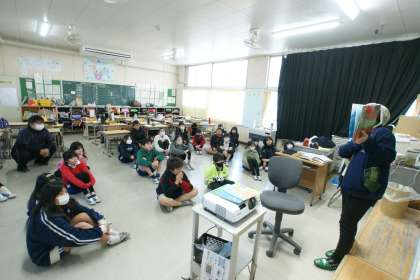写真中…5年1組、昨日の絵本の読み聞かせです。