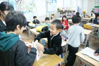 写真上…児童・JRC委員会が行っている「能登半島地震復興支援・お年玉募金」活動の様子です。(19日まで・日本赤十字社に送ります)