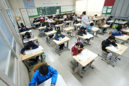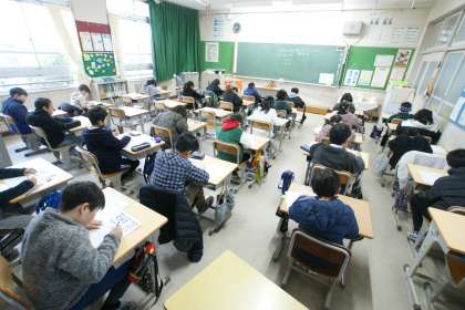 写真下…3年2組、学力検査の様子です。