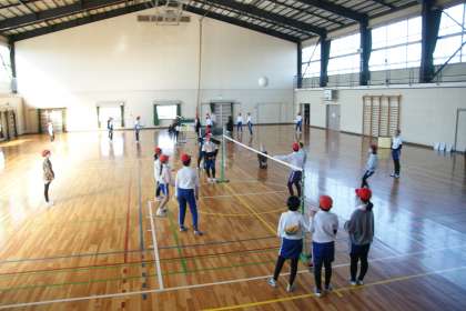 写真上…6年1組、体育「ソフトミニバレーボール」の学習です。