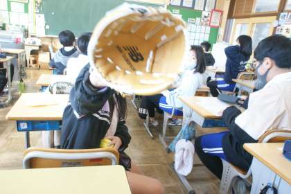 写真中…6年1組、今朝の集会を受けて、6年生から順に「大谷選手寄贈のグローブ」を回します。