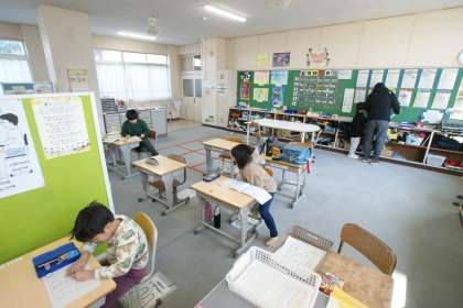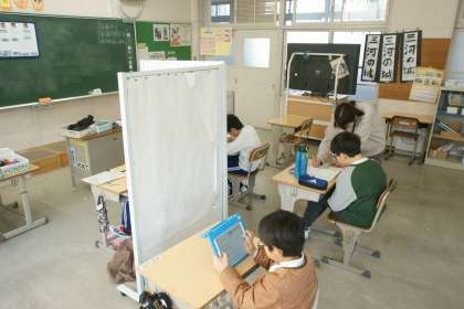 体幹を鍛える運動の後は、いすに座っての学習です。