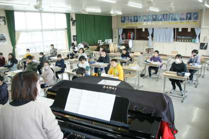 写真上…4年1組、音楽「子どもの世界」の学習です。
