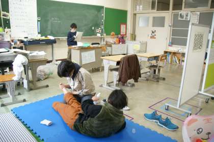 「学習発表会」の司会のセリフをすらすら言えるように練習する男児、担任の先生に足のマッサージを受けている女児です。