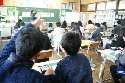8組の先生と一緒に、しっかりと説明を聞いています。