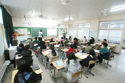 写真上…5年1組、算数「割合のグラフ」の学習です。