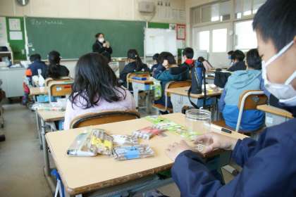 写真上…3年1組、図工「空き容器の変身」の学習です。