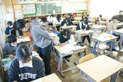 写真中…6年2組、算数の学習です。