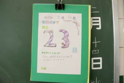 写真下…6年2組、黒板の隅に掲示されている『カウントダウンカレンダー』です。