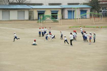 写真下…2年3組、体育「リレー遊び」の学習です。