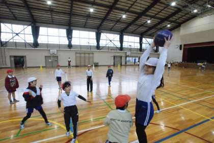 写真上…3年1組、体育「ボール運動」の学習です。