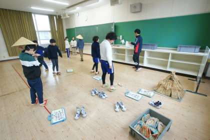 わら草履、下駄、菅笠、黒電話、洗濯板、たらい、はかり天秤、かつお節削り器など、豊田市郷土資料館所蔵の道具を借用し、本物体験をしました。