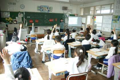 写真上…1年1組、算数「100までのかずのけいさん」の学習です。
