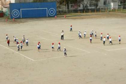 写真中…1年2組、体育「ボールあそび」の学習です。
