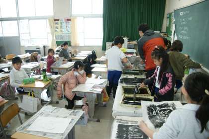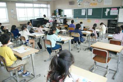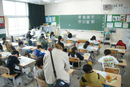写真上…2年1組、音楽「あの青い空のように」の学習です。