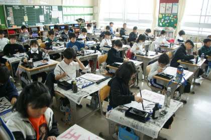 写真中…3年1組、社会科「むかしのくらし」の学習です。