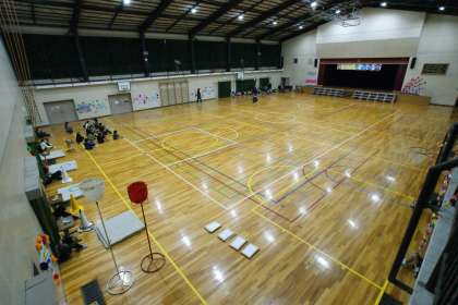 写真上…5年生が体育館の飾りつけや準備をしました。