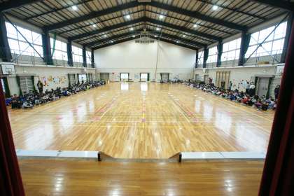6年生は、2人ずつ体育館の舞台から入場します。