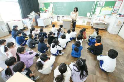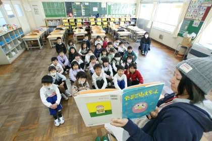 写真上…1年1組、絵本のタイトルは『どうぶつサーカスはじまるよ』『だるまちゃんとだいこくちゃん』です。