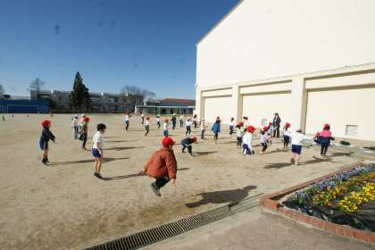 写真下…1年1組、体育の学習です。