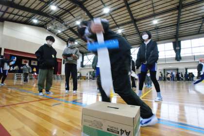 まず、カラーコーン先端に額を付け、目をつぶって10週回ります。